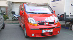 furgoneta Renault que tiene aparcada al lado y pintada con los colores de Montesa-Honda