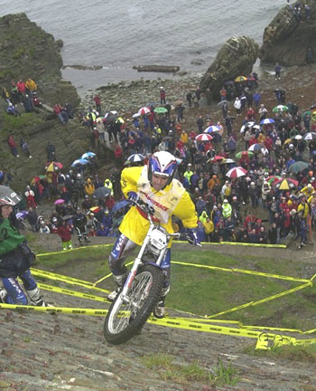Como decíamos, la segunda prueba llegaba a las islas británicas, y en concreto a Douglas, una pequeña ciudad situada en la Isla de Man, conocida mundialmente por su afición a las motos y sobretodo por el Tourist Trophy. De este modo los británicos vivían un mes agitado en cuanto al trial se refiere, pues el fin de semana anterior había finalizado una nueva edición de los Seis Días de Escocia y poco antes el indoor urbano de Manchester. La verdad es que en las Islas hay muchísima afición al trial, y también muchísima tradición.