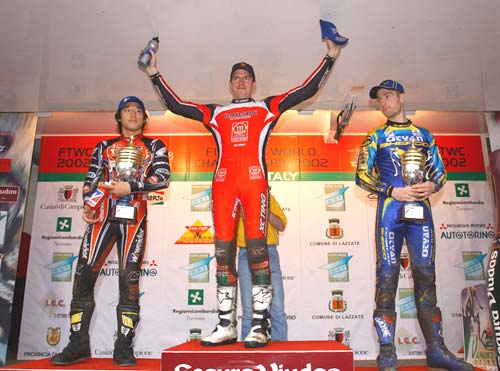 El mundial está llegando a su recta final, y Doug Lampkin se está encargando de dejar las cosas claras afianzándose como líder. Va directo hacia su sexto título mundial y en el Gran Premio de Italia lo confirmó logrando una nueva victoria, la octava consecutiva, en un trial muy difícil en el que la roca y el barro fueron protagonistas. Fujinami seguía tan regular como de costumbre logrando el segundo puesto y Jarvis subía por primera vez al podio esta temporada.