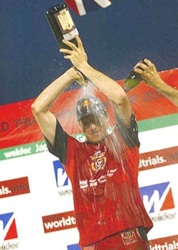Sin embargo Doug Lampkin ya había logrado su máximo objetivo, lograr su sexto título mundial consecutivo, y es que no hay quien le pare. Es cierto que el título estaba un poco empañado por no haber logrado la victoria, y más por haber sucedido las cosas de ese modo, Dougie estaba enfadado con Fuji, pero al tiempo contento por su sexto título. Avalancha de felicitaciones, fotos, periodistas, podio con ducha de cava, en fin una celebración de un sexto título mundial de trial, algo que sólo ha sucedido dos veces en la historia, y por supuesto esa era la noticia de la semana.