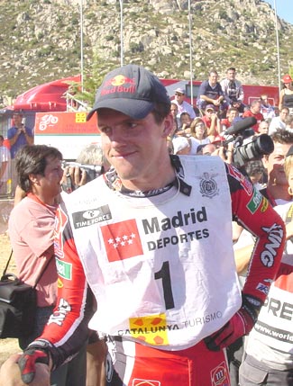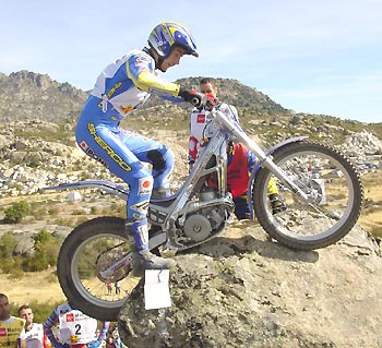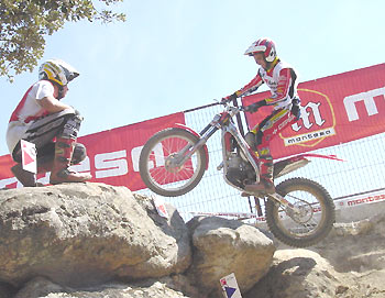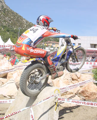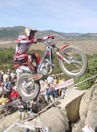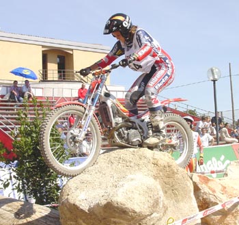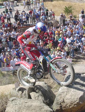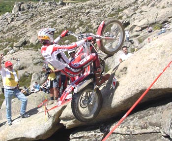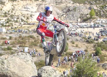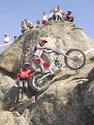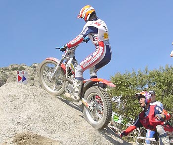 El sol y el calor seguían apretando como en la jornada anterior, pero la última prueba del mundial de trial 2003 estaba ya a punto de finalizar y de proclamar a Dougie Lampkin como Campeón del Mundo por séptima vez consecutiva, ya sólo quedaban unos momentos y el británico poco a poco iba recuperando la concentración en un día que no le estaba resultando nada fácil. Para colmo Dougie sufría una pequeña caída en la interzona, en la que no sufría ninguna consecuencia, pero le recordaba que aún no estaba todo decidido.