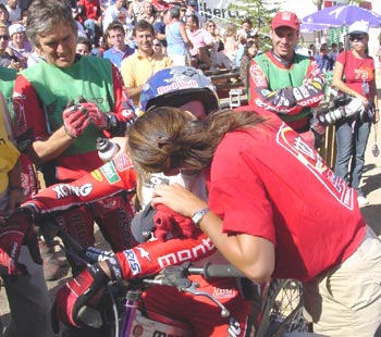 Su madre, su novia Nicola y su padre Martin eran los primeros en felicitarle. Abrazos, besos y muchas felicitaciones de todos los miembros del equipo que también mostraban en sus rostros el duro trabajo realizado. Lampkin allí seguía, casi impasible, pero con gran alegría en su interior, acompañado además de casi toda su familia, el clan Lampkin casi al completo: Martin, Arthur, Alan, John, James... una familia de grandes mitos del trial.