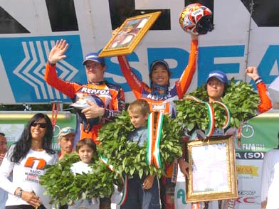 Takahisa Fujinami (Montesa - HRC) volvía a lo más alto del podio en la segunda jornada del Gran Premio de Italia, celebrado en Aprica. De este modo el japonés se consolída como líder al frente de la clasificación general del mundial, recuperando su ventaja de 19 puntos. Con sólo tres jornadas de competición por delante, Fujigas se encuentra en una excelente y fuerte posición. Pocas posibilidades hay de que Dougie Lampkin (Montesa - HRC) recupere la ventaja que le separa de su compañero de equipo, y a estas alturas de temporada pocos pueden imaginar que Fujinami no se convierta en el nuevo campeón tras cinco años de ser subcampeón por detrás de Lampkin.