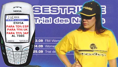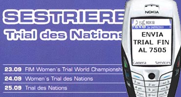 Coste del mensaje: 0,9 € (sin IVA) para España (Movistar, Vodafone, Amena), recibirás 2 mensajes con el resultado final de cada jornada del Trial de las Naciones, más la confirmación a la suscripción con la clasificación del 2004. Un sólo mensaje si te suscribes una vez finalizadas las dos jornadas.