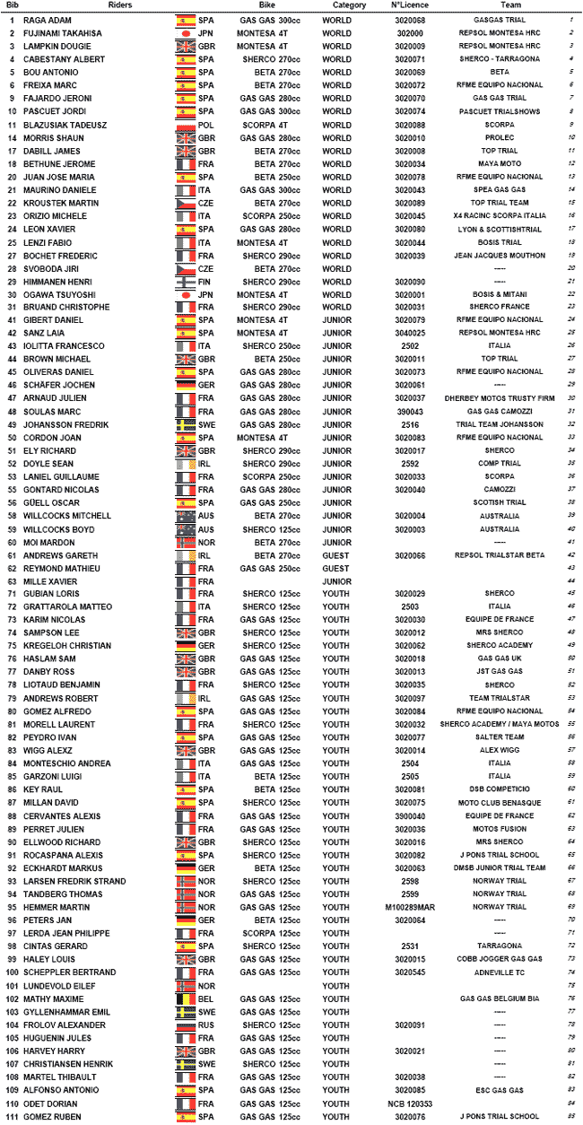 La lista de inscritos en este Gran Premio de Francia es realmente numerosa, en total 85 pilotos, 23 de ellos en la máxima categoría, y siendo el país con más representantes nuevamente España con 21 inscritos, seguido muy de cerca por el país anfitrión, Francia con 20, lo que demuestra el auge del trial en el vecino país galo.