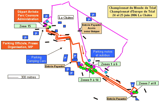 El trazado y las zonas han sido diseñadas por Bruno Camozzi, y la organización corre a cargo del Trial Club du Pays de La Châtre, que cada año prepara en este mismo lugar los Tres Días de Indre. Como podéis ver en el mala del recorrido, será una prueba con el máximo nivel organizativo en la que se intentará facilitar lo máximo posible la estancia a los espectadores, que pagarán su entrada y a cambio obtendrán la máxima atención disponiendo de parkings, autobuses, gradas, zonas de comida, actividades, etc.