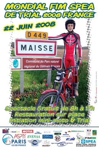 La pequeña ciudad francesa de Maisse,al sur de Paris, tiene el honor de dar la bienvenida al Campeonato Mundial de Trial 2008, una vez de vuelta en Europa despues de los dos largos desplazamentos a USA y Japon.