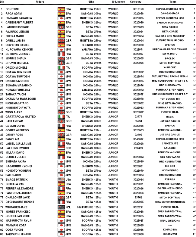A solo dos puntos por detras de Takahisa en la clasificacion general está el ultimo vencedor del Gran Premio de Japón el año pasado, Adam Raga (Gas Gas). Raga consiguió la victoria el año pasado en el Twin Ring ganando a Bou el segundo día del Trial, en lo que fué una tensa batalla en las inigualables zonas que circundan este famoso circuito. Recordemos que el Gran Premio de Japón al igual que el de Estados Unidos se disputan a jornada doble de sábado y domingo.