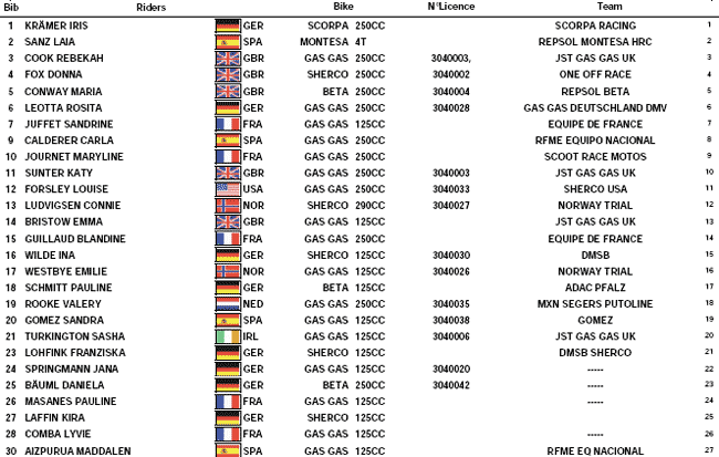 El sabado se abrirá tambien el Campeonato Mundial de Féminas, al mismo tiempo y antes del inicio el domingo de la gran batalla, será la primera de las tres citas puntuables para las chicas. En ella veremos una nueva lucha entre Laia Sanz (Montesa) y la alemana actual campeona Iris Krämer (Scorpa).