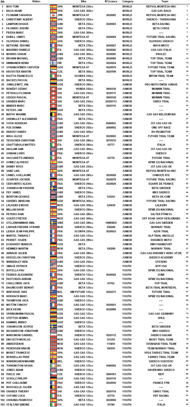 En el mundial, pero en la Copa de Jóvenes de 125cc, también estarán Francesc Moret, Pere Borrellas y Pau Botella. Todos son pilotos semioficiales de la marca de las dos G y Moret y Borrellas son pupilos de Jordi Tarrés, cuyo equipo, el Spea Tarrés Trial Team, dará este año el salto al mundial. En esta categoría la marca tendrá una nutrida representación con 15 de los 33 participantes al manillar de sus motos.
