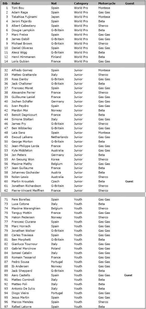 Otro piloto que estará a la espera del fallo tanto por parte de Bou como de Raga es Fajardo, quien merecidamente consiguió la victoria en Andorra previamente al parón de 2 meses del mundial. Aunque cualquier esperanza de retar a los primeros está clara desde hace tiempo para Takahisa Fujinami (Montesa) un buen resultado en España le permitiría colocarse el tercero en el Campeonato. No será fácil ya que tanto Albert Cabestany (Sherco) como Dougie Lampkin (Beta) están a la expectativa también del podio y solamente 2 puntos separan a estos 3 pilotos, aunque Dougie llegará recien recuperado de su lesión en la mano.