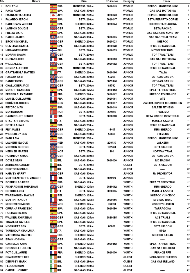 Los otros rivales son una mezcla de pilotos de diferentes nacionalidades y diferentes edades. Jeroni Fajardo (Beta) cumplirá sus 24 años el segundo día del venidero evento en Irlanda, o sea el 5 de Abril, y encabeza la nueva era de talentos que debe reemplazar a los ya veteranos Takahisa Fujinami (Repsol Montesa HRC) y Dougie Lampkin (Beta).
