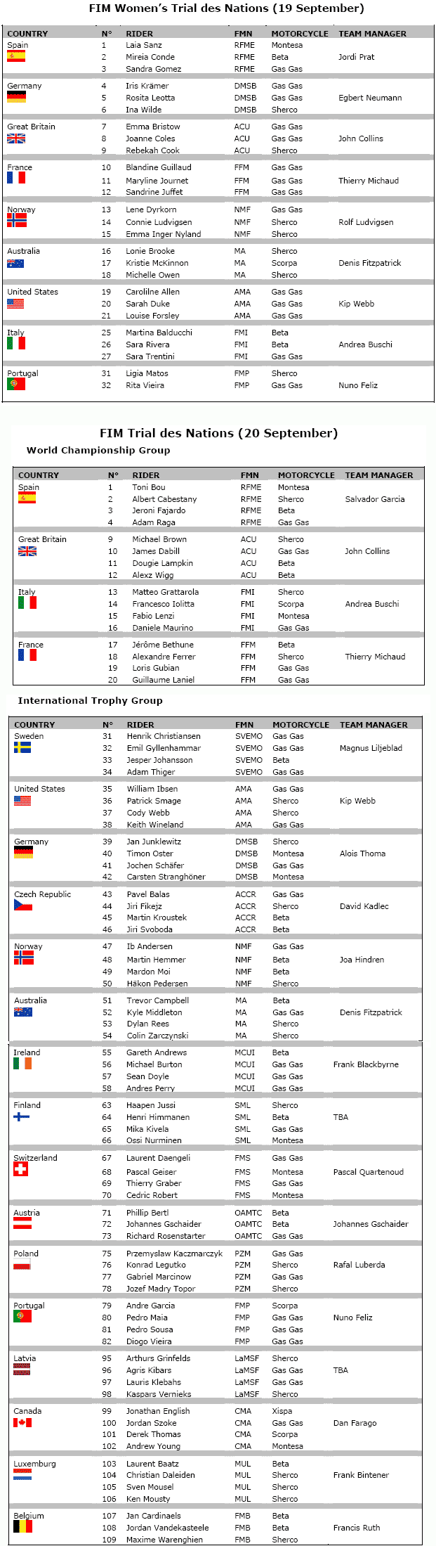 El dúo español Toni Bou (Montesa) y Laia Sanz (Montesa) que recientemente ganaron el título individual Mundial, centran ahora su atención con la esperanza de dirigir a sus equipos nacionales al éxito en las competiciones a celebrar este fin de semana, el Trial de las Naciones y el Trial de Féminas de las Naciones, respectivamente. La ciudad italiana de Darío Boario Terme acogerá ambos prestigiosos eventos que señalarán el final del Mundial de Trial 2009.