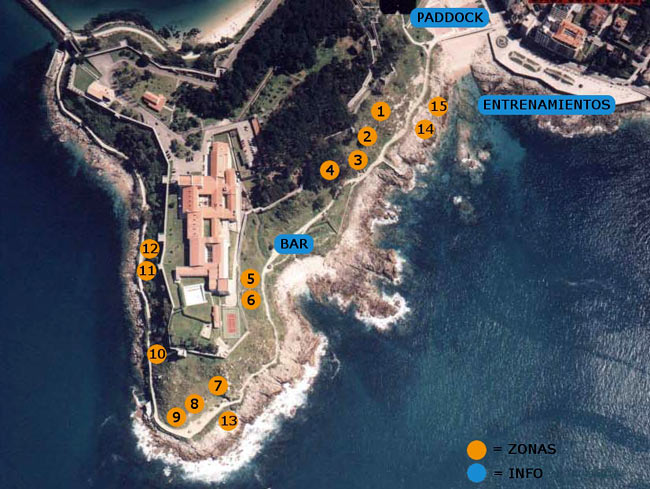Las zonas estarán situadas en las inmediaciones del paseo al monte do Boi, que rodea las instalaciones del parador nacional de turismo de la villa. Este año además podremos disfrutar de unas importantes mejoras aplicadas sobre el pavimento del paseo, sobre el cual se podrán ver las evoluciones de los pilotos incluso "en tacones".