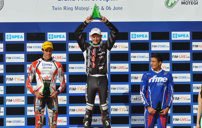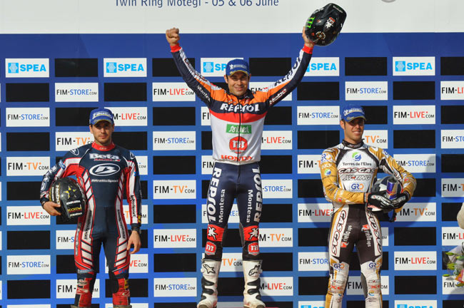 Después de fallar y quedar fuera del podio en la segunda jornada del Gran Premio de Portugal, última cita del Mundial, Toni Bou (Montesa) tenía ganas de llegar a Japón para quitarse la espina. Y eso es precisamente lo que ha hecho, y de manera contundente. Tras un Bou inalcanzable en este espectacular trial celebrado en el circuito Twin Ring de Motegi, se colocaban en el podium otros dos pilotos españoles, Jeroni Fajardo (Beta), y en tercer lugar Adam Raga (Gas Gas).