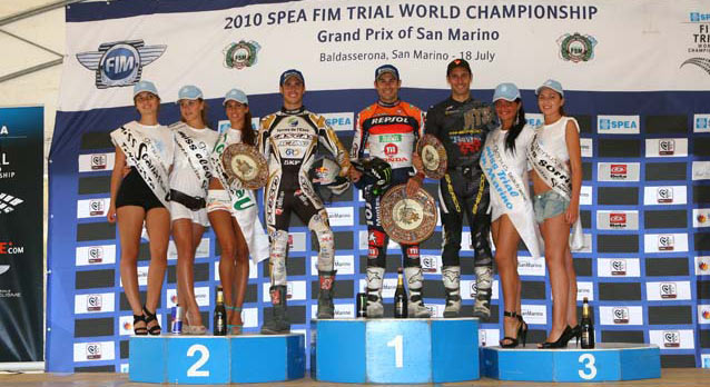 Exito total para los pilotos españoles en el sexto Gran Premio del Mundial celebrado en San Marino, copando ls cuatro primeras plazas de la máxima categoría. Toni Bou ha vuelto a ser claro vencedor, seguido de Raga y Cabestany en el podio, con Fajardo en la cuarta posición. En Junior la victoria se la ha llevado el británico, pero Moret y Gómez han ocupado las otras dos plazas del podio, mientras en Juvenil Pol Tarrés y Carles Traviesa han sido primero y segundo.