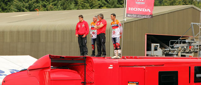 del equipo Montesa, viendo el espectáculo desde lo alto del camión