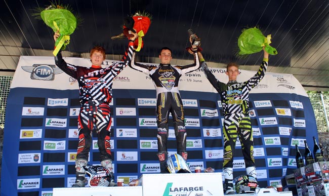 Por tanto el podio final quedaba configurado con Toni Bou en lo más alto con 9 puntos, segundo Adam Raga con 19 y tercero Albert Cabestany con 22. Algo más atrás la lucha por el cuarto puesto entre Fujinami y Fajardo se decantaba en favor del japonés, que a pesar de empeorar volvía a marcar un mejor parcial que el de Ossa, finalizando con un total de 30 frente a los 38 de Fajardo. La clasificación daba un vuelco en el resto de posiciones, ya que quienes marchaban más atrasados del grupo perseguidor eran quienes finalmente lograban superar al resto. De este modo James Dabill era finalmente sexto con nada menos que 61 puntos gracias a su segundo parcial de 23, y con dos puntos más finalizaba Gubian. Otros dos puntos más (65) era los que marcaba Challoner, mientras Brown sumaba 66 y se veía relegado a la novena plaza. Mal fin de semana para el italiano Grattarola, pues tras una jornada del europeo sin suerte en el mundial sólo podía ser décimo con 70 puntos. Con 74 le seguía Alexz Wigg y completaba la clasificación de sólo 12 pilotos Francesco Iolitta con 105 puntos, lo que demuestra las enormes diferencias de nivel. En la clasificación general del campeonato Bou incrementa su ventaja sobre Adam Raga a 10 puntos (75 a 65), Cabestany es tercero con 62, y ya más retrasados están Fujinami (52), Fajardo (50), Dabill (37), Gubian (33), Brown (32), Challoner (29)... En la categoría Junior, Alfredo Gómez (Montesa) seguía los pasos de Bou, ya que pronto comenzaba a distanciarse del resto y aunque aquí las cosas estuvieron más apretadas, se colocaba líder al finalizar la primera vuelta con un parcial de 3 puntos. Con 5 le seguía el francés Benoit Dagnicourt (Beta), y con 7 un acertado Carles Traviesa (Gas Gas) al que por fin parecían salirle bien las cosas y no caer en problemas de mala suerte. También con 7 marchaba el belga Maxime Warenghien sacando provecho de su pilotaje agresivo y con un punto más acechaban Francesc Moret (Montesa) y Pol Tarrés (Gas Gas).