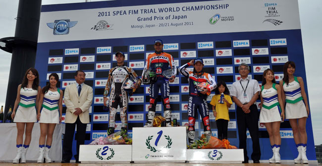 Toni Bou (Montesa) ha dado un paso más para ganar su quinto título oudoor consecutivo gracias a un triunfo logrado en condiciones difíciles en esta primera jornada de la séptima prueba del Campeonato del Mundo de Trial 2011 celebrado en el circuito Twin Ring de Motegi en Japón. Bou tuvo que luchar duramente en todas las zonas, que habían quedado empapadas por la lluvia caída durante la noche, para vencer a su compatriota Adam Raga (Gas Gas) por un sólo punto tras una igualada y emocionante lucha en este día, nublado y húmedo. Raga cometió dos errores críticos en los primeros momentos de la segunda vuelta que lo puso en una desventaja de la que no fue capaz de recuperarse. Takahisa Fujinami (Montesa) terminó tercero frente a sus compatriotas, aunque no estaba del todo contento con su pilotaje.