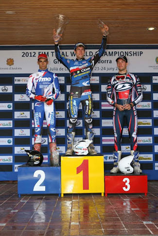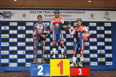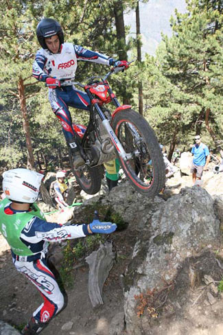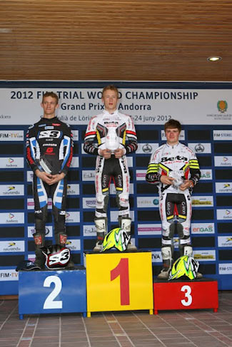 Toni Bou sigue intocable y se ha vuelto a adjudicar una ronda más del Mundial, esta vez gracias a una excelente segunda vuelta en la que no ha dado opción. De cerca le ha seguido Jeroni Fajardo, segundo, mientras Fujinami ha sido tercero. En Junior también repite victoria Alexandre Ferrer, con un espectacular Jorge Casales segundo y Benoit Dagnicourt cerrando el podio. La categoría Juvenil ha sido dominada por Sverre Lundevold, seguido de Steven Coquelin y Bradley Cox. El imparable Toni Bou (Montesa), gracias a una increible segunda vuelta y a pesar de montar con un desgarro muscular, ha logrado su octava victoria consecutiva en el primer día del Gran Premio de Andorra celebrado en el complejo Naturlandia de Sant Julià de Loria. Pero las cosas no fueron tan fáciles como pudiese parecer, ya que en la primera vuelta Bou estaba segundo por detrás de Jeroni Fajardo (Beta) que realizaba un magnífico paso por las zonas con un parcial de sólo 6 puntos frente a los 10 de Bou y Takahisa Fujinami (Montesa). En la lucha por el podio también estaba Adam Raga (Gas Gas) que con 13 puntos concluía el primer paso por las 15 zonas. En la segunda vuelta Fajardo se mantuvo más o menos constante, aunque sumaba dos puntos más que en la primera (8), pero Bou daba todo de si y realizaba un impecable parcial de sólo 1 punto, llevándose la victoria con un total de 11 frente a los 14 de Fajardo, que era segundo. Fujinami realizó dos vueltas de mucho mérito, sobre todo teniendo en cuenta la reciente lesión en el dedo, para situarse al final en el tercer lugar del podio con un total de 20 puntos. Adam Raga una vez más galló en su intento de remontar posiciones y tuvo una actuación en línea a como nos tiene acostumbrados esta temporada, unas veces arriba y otras abajo.