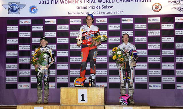 Las pilotos del mundial ahora realizarán un corto viaje hasta Moutier, también en Suiza, donde el próximo viernes se disputará el tercer Gran Premio de la temporada y la quinta y última ronda del Mundial femenino. Laia tendrá como objetivo permanecer imbatida adjudicándose la quinta victoria, mientras Bristow, Cook y Gómez lucharán por las otras dos posiciones de podio, ya que en la general ahora Bristow es segunda con 51 puntos, Cook tercera con 45 y Sandra Gómez desciende a la cuarta plaza con 43. Juffet es quinta con 39 y Mieria Conde sexta con 24. En pocos días sabremos como finaliza el campeonato. Laia Sanz: "Nunca había imaginado que llegaría a ganar doce títulos. Da un poco de vértigo, pero tuve la suerte de empezar a ganar muy joven y todavía soy joven para seguir ganando títulos. Para mi este título tiene una dificultad añadida. Vengo, de hecho estoy, en una lesión. Estoy compitiendo en dos especialidades mas, enduro y Dakar y todo esto me ha robado horas de preparación con la moto de trial. Para mi este título tiene un valor especial, después de ganar un Dakar y de estar primera en el mundial de enduro, he podido revalidar el título en trial y esto me hace muy feliz." Sandra Gómez: "No ha sido una carrera fácil, no nos ha llovido pero el terreno estaba igualmente embarrado. La verdad es que he hecho cosas muy buenas, pero otras demasiado malas. Ha sido un trial con terreno inglés, es increible como van por aqui! Tampoco es que me haya sonreído la suerte ni un poco. Bueno, en definitiva un fin de semana con dos quintos, no estoy muy contenta pienso que puedo estar más arriba y quiero estarlo, voy a aprender de los fallos cometidos y este viernes darlo todo para estar ahí."