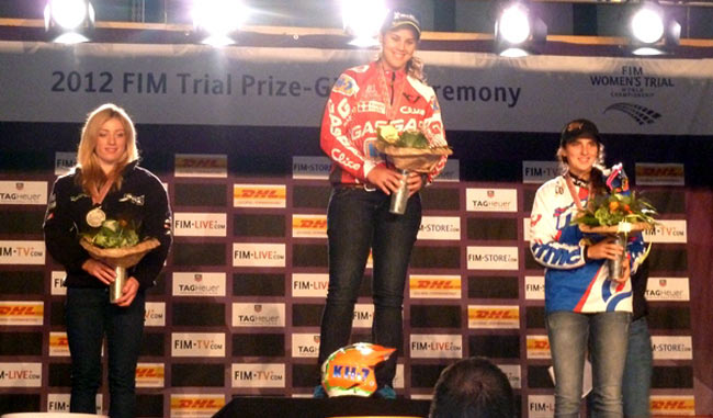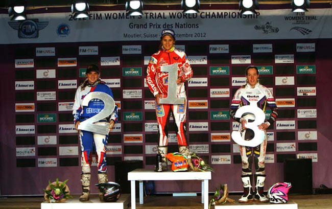 Laia Sanz ha completado el Campeonato del Mundo de Trial de Féminas 2012 con pleno de victorias al vencer en la última ronda celebrada en Moutier (Suiza), seguida de Sandra Gómez y Becky Cook. En la clasificación final el subcampeonato es para Emma Bristow y el tercer puesto para Sandra Gómez. Con 5 victorias de 5 posibles Laia Sanz (Gas Gas) mantiene su dominio absoluto en el Mundial Femenino y refuerza su posición de líder tras obtener su 12º título mundial el pasado fin de semana. Pilotando sin presión, Laia se sentía muy cómoda y estaba determinada a mantener el 100% de victorias esta temporada a pesar de que aún mantiene secuelas de la lesión en el pie. Sanz no tuvo el más mínimo problema en las resbaladizas zonas y nunca ofreció sus rivales la menor oportunidad de derrocarla en este quinto y último día puntuable para el campeonato.