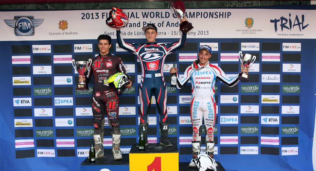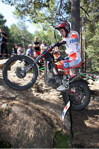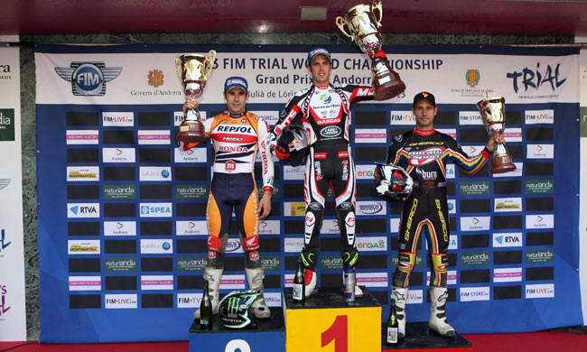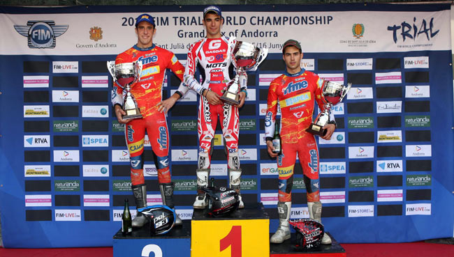 El Gran Premio de Andorra no termina, ya que falta la jornada del domingo que se prevé igual de calurasa, y en la que de nuevo partirán todas las categorías, desde la absoluta, los junior y juveniles hasta las féminas. Adam Raga: "Estoy muy contento de esta victoria porque no ha sido nada fácil. En la primera vuelta Toni (Bou) estaba pilotando muy fuerte y había mucha presión porque iba tras él. Pero he sabido llevarlo bien. He sido decisivo en la zona que tenía que serlo y he conseguido una gran victoria. Ganar tres carreras seguidas no es nada fácil. Me siento bien físicamente y también quiero agradecer al equipo el gran trabajo de preparación de la carrera. Ha sido un plus". Toni Bou: "Cuesta marcar diferencias en este tipo de pruebas, con muchas zonas pero en su mayoría bastante fáciles. Los controladores han sido estrictos y esto es positivo, pero en general el trial ha sido demasiado fácil. No me gusta el nuevo reglamento, lo digo una vez más, y me cuesta adaptarme a él. En estas condiciones se trata de fallar cuanto menos mejor y ser lo más constante posible en los resultados". Takahisa Fujinami: "He empezado con una sensación de tensión física y ya en la tercera zona he confirmado que los controladores eran muy estrictos. Me he visto obligado a cambiar el estilo de pilotaje, lo cual explica que, a diferencia de mis principales rivales, haya terminado la primera vuelta dentro del tiempo permitido. En el segundo giro me he sentido mejor, pero he cometido dos fiascos casi al final que me han costado una posición". Jorge Casales: "Ha sido una carrera muy dura desde el inicio hasta el final. En la primera vuelta he cometido dos errores que se han transformado en dos fiascos que han igualado las puntuaciones. En la segunda vuelta iba muy bien, pero creía que sólo tenía 4 puntos de ventaja antes de la última zona. He entrado en ella pinchado y he cometido un fiasco. ¡Hasta que no he llegado al paddock no he sabido que había ganado!".
