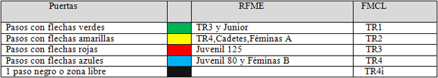 opciones: Las verificaciones técnico-administrativas para este trial se harán el sábado de 9 a 11 de la mañana. El trial del sábado dará comienzo a las 12,30 horas de la mañana con la salida del primer participante y se saldrá, en principio, por niveles de menor a mayor dificultad, es decir, los últimos que saldrán serán los TR3, y Junior de la Copa de España y los TR1 de Castilla y León. El horario del trial infantil se establecerá como siempre sobre una hora antes de terminar el trial principal (aproximadamente sobre las 5 ó 6 de la tarde del sábado). El trial principal se dispondrá a dos vueltas con 12 zonas por vuelta y control de tiempo en salida, 1ª vuelta y 2ª vuelta en mesa. Terminado se procederá a la entrega de trofeos de los 2 campeonatos. El reglamento que regirá el trial del sábado será el habitual, es decir que se puede parar y mover en parado respetando el resto de normas del mismo. Los pasos que han de afrontar los pilotos son: