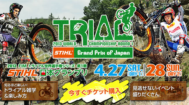 El Gran Premio de Japón constará como siempre de dos días de competición, y esta vez será el punto de salida para la temporada mundialista 2013, que visitará ocho países diferentes y tres continentes entre Abril y Septiembre. Confirmando su status de auténtico Campeonato Mundial las competiciones se desplazarán rápidamente de Asia a América, ya que la segunda prueba se celebrará en Sequatchie, Estados Unidos, a finales de Mayo. Después de los dos iniciales desplazamientos aéreos el trial regresará a Europa en Junio, para iniciar la fase más intensa de la temporada. Andorra será la sede del tercer trial de 2 días consecutivo, con el Campeonato regresando a terreno familiar en las alturas de las montañas del pequeño pero rocoso Principado. El Gran Premio de Andorra será en Sant Julià de Loria, y el primero de tres triales combinados a celebrar en la temporada, ya que con este se incluye la primera prueba del Campeonato del Mundo Femenino FIM 2013. Los siguientes tres triales masculinos tendrán lugar a continuación y sin descanso, una semana tras otra. El trial de un día que se celebrará en Pobladura de las Regueras (Leon), en el Norte de España tendrá lugar al final de Junio y marcará el ecuador del Campeonato. El