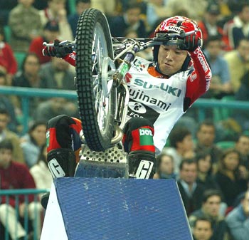 Lisboa (Portugal), 21.02.2004.- Dougie Lampkin (Montesa-HRC Cota 315R) y Takahisa Fujinami (Montesa-HRC RTL 250) figuran empatados a puntos en la segunda posición de la clasificación general del Campeonato del Mundo de Trial Indoor tras la disputa, en el Pavellón Atlántico de Lisboa, y ante 6.500 espectadores, de la octava prueba puntuable. El resultado del duelo entre los dos pilotos de Repsol-Montesa HRC se prevé absolutamente incierto y será uno de los puntos de atención en las próximas citas del certamen.