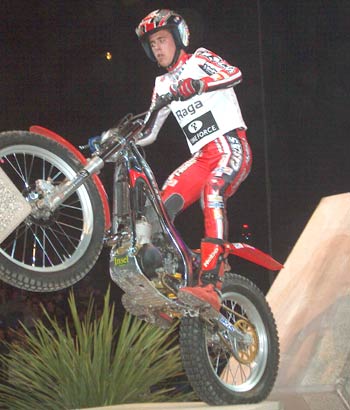 Niza (Francia), 20 de marzo de 2004. Adam Raga (GAS GAS TXT 300), flamante bi-Campeón del Mundo de Trial Indoor, ha sumado en el Trial de Niza su séptima victoria en este certamen, sexta de forma consecutiva. El de GAS GAS no cede y, aunque ya se hizo con el título el pasado fin de semana en Granada por segundo año consecutivo, ha vuelto a subir a lo más alto del podio por delante del también tarraconense Albert Cabestany y del británico Doug Lampkin. Este penúltimo indoor ha tenido lugar la pasada noche en Niza, en el estadio de Nikaia.