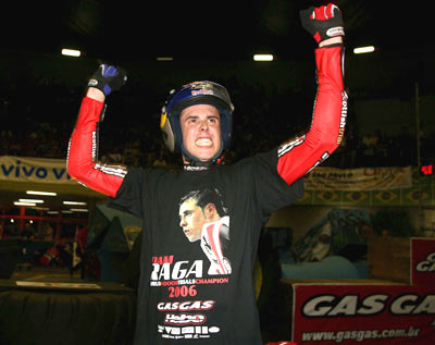 Sao Paulo (Brasil), 5 de marzo de 2006. Cumpliendo con las expectativas más optimistas y aplicando un pilotaje totalmente genial y de altísimo nivel, Adam Raga (GAS GAS TXT Pro 300) ha conseguido la pasada madrugada su cuarto título mundial de trial indoor, dos carreras antes del final de temporada, al vencer de forma muy clara el Gran Premio Cidade de Sao Paulo.