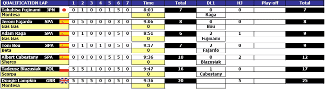 Fujinami ha sido el mejor del primer giro tras renunciar ha cubrir la sexta zona para conseguir un buen tiempo que le permitiese asegurarse el acceso a la final. Su compañero de marca en Montesa Dougie Lampkin ha sido séptimo y último como consecuencia de una floja actuación.
