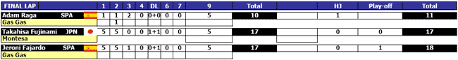 Raga ha cimentado su sexto triunfo de la temporada en las dos primeras zonas de la gran final ya que las ha solventado con tres puntos de penalización mientras sus rivales Jeroni Fajardo y Takahisa Fujinami se cargaban con 10 puntos. Estos dos últimos pilotos han llegado empatados al final de sus respectivos recorridos y han dirimido la lucha por el segundo lugar final en una carrera vencida por el japonés que, de esta forma, logra su mejor resultado de la temporada.
