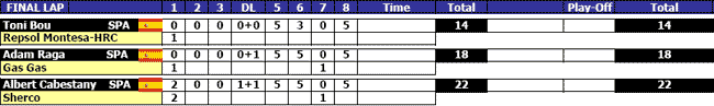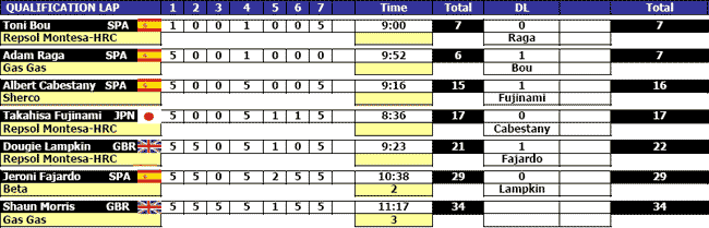 | Piloto | Bou | Raga | Cabestany | Fujinami | Lampkin | Fajardo | Morris |