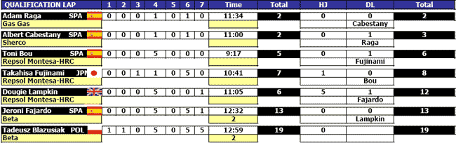| Piloto | Raga | Cabestany | Bou | Fujinami | Lampkin | Fajardo | Blazusiak |