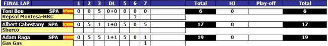 El piloto del equipo Repsol Montesa-HRC volvió a realizar una actuación sensacional que le permitió superar con cierta claridad a sus rivales en la final, Albert Cabestany y Adam Raga, segundo y tercero respectivamente y separados por dos puntos de diferencia.