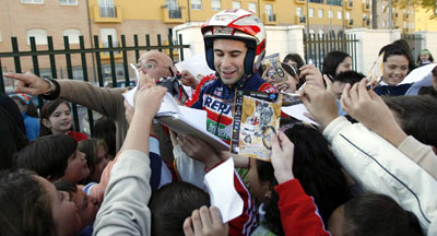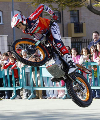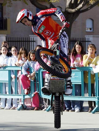 El piloto español ha ofrecido una exhibición a lomos de su Montesa al finalizar la conferencia en el patio del colegio delante de los niños y del resto de aficionados que se han acercado para ver la destreza del piloto español encima de una moto de trial.