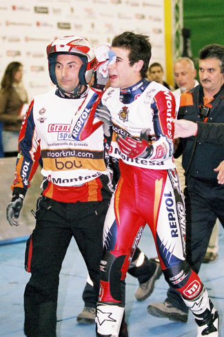 Toni Bou: Tras el golpe me he mareado un poco y no me encontraba bien. He llegado a pensar que no podría continuar, pero he vuelto a la carrera y he podido acabar. Conseguir este resultado en estas condiciones es increíble, estoy muy contento con esta nueva victoria. Dos victorias y una segunda posición suponen un buen balance a mitad de campeonato. El triunfo de hoy ha sido muy duro, casi increíble. Estaba lesionado y tras el fuerte golpe no me sentía bien, incluso en algún momento he dudado de poder seguir, pero he conseguido sacar todo mi genio tras penalizar los diez puntos que me ha costado la caída. Este tipo de incidentes confirman que en un momento se puede perder toda la ventaja adquirida, y más cuando aún quedan treinta puntos en juego. No podemos negarlo, nuestra situación es buena pero no hay que considerarla, ni mucho menos, como definitiva.