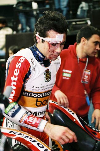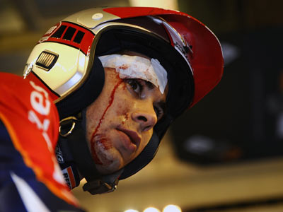El piloto del Repsol Montesa-HRC ha sufrido una caída y se ha abierto una monumental brecha en una ceja al inicio de la segunda vuelta, pero el barcelonés ha ingresado de nuevo en competición para acabar imponiéndose en la final a Albert Cabestany y Takahisa Fujinami.