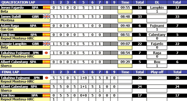 Tras ser atendido y tener que saltarse la zona 3, el de Repsol Montesa-HRC volvía a la competición para defender el primer puesto. Después de las carreras, Bou supo administrar su ventaja y exhibió su fuerza y calidad sobre la moto para superar a sus rivales.