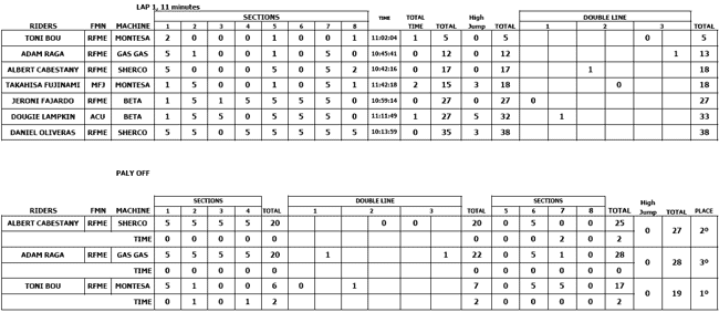El de Repsol Montesa HRC ha realizado una primera vuelta increíble penalizando tan solo cinco puntos. La segunda plaza para el play off ha sido para Adam Raga con trece puntos, y la tercera y última plaza ha sido para Albert Cabestany que ha cerrado la primera vuelta con 18 puntos, los mismos que el japonés Takahisa Fujinami, que ofreció una buena actuación en la primera vuelta, pero un error imperdonable en el salto de altura le arrebató el paso a la final, al quedar empatado con Cabestany, que ha tardado menos tiempo en recorrer las zonas y por eso ha sido el piloto que ha pasado a la ronda que da derecho a podio.