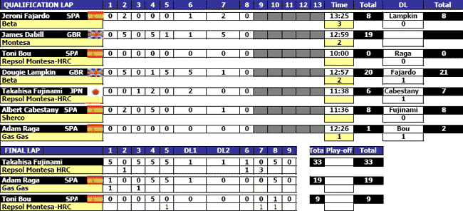 | Piloto | Bou | Raga | Fujinami | Cabestany | Fajardo | Lampkin | Dabill |
