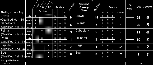 En la ronda final la multitud que abarrotaba el pequeño escenario pudo disfrutar de las constantes muestras de brillantez ofrecidas por Bou, que mantuvo toda la concentración a pesar de la constante lucha con Raga, marcando cero tras cero en las zonas más técnicas. Así Bou estuvo al frente desde el inicio, batiendo fácilmente a Fajardo en la carrera en paralelo, que iniciaba la final.