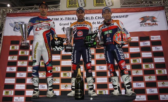 Amplísima presencia política en el espectáculo, con nada menos que el propio presidente José Ramón Bauzá disfrutando de la fiesta y entregando el trofeo de ganador a Toni Bou, acompañado de Joan Rotger, Fernando Gilet haciendo lo propio con Cabestany y Fujinami. Ahora el Mundial de X-Trial sigue su marcha sin pausa, ya que la penúltima prueba se celebrará en Milán, Italia, el próximo sábado, donde Bou puede alzarse con su sexto título consecutivo en esta disciplina, para ello le bastaría con ser quinto. Toni Bou: "Ahora sí que puedo decir que la mayor parte de trabajo está hecha, con cinco victorias y 34 puntos de ventaja cuando solo quedan 40 en juego. En Milán no vamos a cambiar los planteamientos y voy salir con la mente puesta en lograr un nuevo triunfo. Aquí, en el Palma Arena, lo importante no eran las diferencias de más o menos puntos sino evitar en lo posible los errores que, por las características de las zonas, hubieran sido muy difíciles de recuperar. Todo ha salido perfecto." Takahisa Fujinami: "Estoy muy satisfecho por este podio, que para mi ha tenido un significado especial. Ya antes de empezar consideraba que sería muy bonito lograrlo en una fecha tan significativa para todos los japoneses. Deseaba este podio y lo he logrado, creo que no puedo pedir más. He estado en condiciones de poder mejorar la tercera posición pero un error en la penúltima zona ha sido decisivo." Àdam Raga: "No puedo estar satisfecho, porque no era esto lo que esperaba de esta carrera. Sin embargo, tampoco puedo estar enfadado, porque no ha ido mal. De hecho, hemos hecho un buen trial a excepción de la entrada en la zona 1 y de las carreras. La clave ha estado en que era una prueba muy fácil, con zonas en las que era imposible marcar diferencias, de modo que cualquier pequeño error se hacía muy difícil de recuperar. En estas circunstancias, las carreras en paralelo han vuelto a ser decisivas, aunque hoy tampoco me han ido del todo mal, ya que me he quedado a muy poca distancia de ganar en todas. Creo que esta ha sido una de esas carreras en las que puede decirse que nos ha faltado un poco de suerte, ya que cualquier pequeño error podía ser fatal, y lo ha sido. No ha sido una mala carrera, pero sí un mal resultado. Ahora toca volver a centrarnos en trabajar y entrenar con tanta o más intensidad y fuerza que nunca para recuperarnos la próxima semana en Milán".