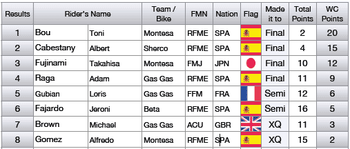 Loris Gubian (Gas Gas) y Fujinami fallaban ambos con un fiasco, teniendo que realizarse un segundo desempate entre ellos para ver quien ocupaba la quinta y sexta plaza provisinales, y que fue a favor del popular piloto japonés al completar la zona en 20,3 segundos frente a los 22,2 del francés. Jeroni Fajardo (Beta) fue el siguiente mejor con un tiempo de 22 segundos, un tiempo que Cabestany lograba superar en 2 segundos.. Raga parecía haber puesto a Bou bajo presión real, al marcar un tiempo de solo 16 segundos, pero Toni mostraba su impresionante pilotaje cuando cruzaba la línea de fin de zona en sólo 10,2 segundos para encabezar el orden de la calificación. En la semifinal Bou abrió de inmediato una buena ventaja ya que era el único que lograba superar a cero la primera zona. Su ejecución del altísimo doble escalón fue simplemente exquisita pero Cabestany se dejaba un pie premeditado para asegurar dando comienzo a una lucha que se prolongaría de manera intensa hasta el final.