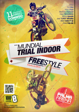 El deporte balear está de enhorabuena, después de organizar en 2010 una prueba del Campeonato del Mundo de Trial Indoor, considerada extraoficialmente como la mejor del calendario, 100 Emocions ha conseguido de nuevo que la Federación Internacional de Motociclismo haya incluído a Mallorca en el calendario 2012 con una prueba puntuable para el Campeonato del Mundo de X-Trial, que es como se denomina ahora el mundial indoor. Así que los mejores pilotos del mundo, encabezados por el once veces Campeón del Mundo, el genial Toni Bou, que se enfrentará a otros monstruos como Albert Cabestany, Adam Raga, Takahisha Fujinami o Jeroni Fajardo, se darán cita el próximo domingo 11 de marzo en las instalaciones del Palma Arena para deleite de los aficionados a los deportes de riesgo. Pero en esta ocasión no vibrarán sólo con el trial, sino que disfrutarán de un completo menú, ya que a las increíbles acrobacias de estos magos del trial se añadirán los siempre impresionantes saltos de algunos de los mejores freestylers del momento, como son José El Loco Miralles y Edgar E.T. Torronteras en motos, mientras que en bmx los encargados de alucinar al personal serán Gerard Plata o Bienve Aguado, que fue la auténtica estrella en el recordado Freestyle Megaramp 2011 celebrado en la Plaza de Toros de Palma, en lo que será un aperitivo de la edición 2012 del siempre esperado Freestyle veraniego, uno de los eventos más importantes del año en nuestra isla y que cumplirá el próximo mes de julio su octava edición consecutiva.