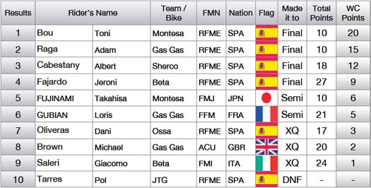 Cada una de las zonas suponían un fuerte desafío, con grandes escalones que probaban la capacidad de los pilotos y su nervio. Los pilotos invitados Dani Oliveras (Ossa) y Giacomo Saleri (Beta) montaron bien, pero quedaban eliminados en la fase inicial sin poder pasar a la semifinal, al igual que el retirado Tarrés y que un decepcionado Michael Brown (Gas Gas), que finalizaba en el octavo y puesto, detrás de Oliveras, en séptimo lugar. La semifinal fue igual de intensa. Incluso Bou cometió un error y marcó un cinco para sorpresa de la multitud. Un Loris Gubian (Gas Gas) no muy acertado y un inconsistente Takahisa Fujinami (Montesa) que cometido demasiados errores quedaron eliminados del pase a la siguiente fase. Jeroni Fajardo (Beta) luchó un poco mejor y logró el objetivo que se había marcado de pasar a la final, junto con Cabestany, Raga y Bou. Los cuatro se enfrentaron a lo largo de cuatro zonas con Raga muy luchador y pisándole los talones a Bou.