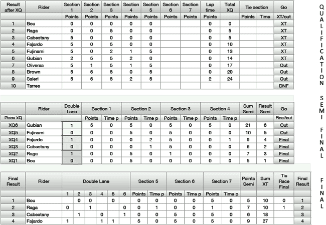 Sin embargo, nadie esperaba Bou se resbalase, sobre todo de una manera tan torpe, cayendo desde lo alto de uno de los mayores obstáculos en un paso que no dejaba margen para el error. El desempate en la carrera en paralelo fue un final para comerse las uñas, resultando ser un acontecimiento extraordinario. Al final Bou era el vencedor por un pelo, y los esfuerzos de Raga le llevaron a lograr la segunda plaza y alzarse a la segunda posición de la general y salir de Italia empatado a puntos con Cabestany. Aunque el título ya está decidido, la heroica actuación de Raga ha puesto en marcha lo que será un tensa y emocionante lucha por el subcampeonato en la prueba final del Campeonato del Mundo de X-Trial 2012 en Bercy, París (Francia) dentro de dos semanas. Pero seguramente Bou seguirá en plena forma e intentará mantener su imbatibilidad en el campeonato 2012.