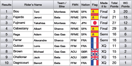Michael Brown (Gas Gas), Jack Challoner (Beta) y el otro piloto invitado, Benoit Dagnicourt (Beta) también quedaron fuera de la siguiente fase. Por su parte Takahisa Fujinami (Montesa) sumaba diez puntos en la fase de calificación, cuatro más de Ferrer, cuya cifra era tan sólo seis puntos. Adam Raga acabó sólo un poco mejor que Ferrer, con cinco puntos. Jeroni Fajardo demostró que estaba en su mejor forma desde el principio del año, dejando sólo un pie, mientras que Albert Cabestany en principio parecía capaz de poner bajo presión a Bou, ya que los dos terminaron empatados a cero puntos, teniédo que realizarse un desempate en el que Bou se colocaba líder. En la semifinal se añadia una zona nueva espectacular, de una altura imponente, una bonita y llamativa reproducción del paisaje urbano de París, con algunos rascacielos y hasta el famoso Arco del Triunfo en el centro. Esta sección demostró ser demasiado difícil para Ferrer, Fujinami, Raga y Cabestany.